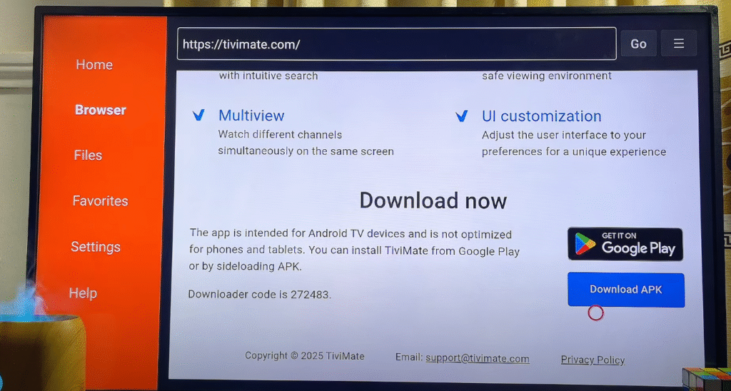 Starten Sie die Downloader-App und geben Sie die offizielle TiviMate-URL ein.